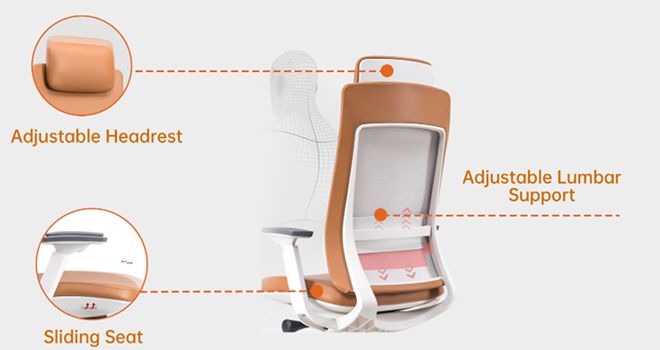 Verstelbare hoofdsteun Verstelbare lendensteun Glijdende stoel